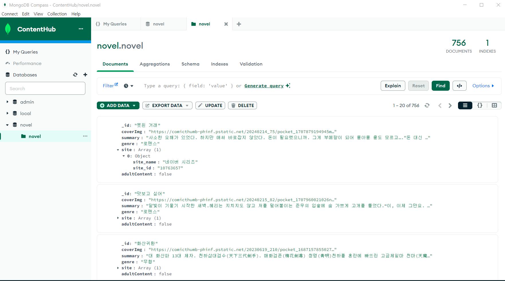하나의 작품이 여러 사이트에서 연재될 수 있다는 점을 고려하여, 해당 작품의 사이트 정보를 리스트로 저장할 수 있도록 했습니다. MongoDB는 유연한 데이터 모델을 제공하여 리스트 형태의 데이터를 쉽게 다룰 수 있었습니다.