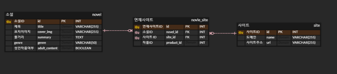 MySQL에서는 리스트 형태의 데이터를 직접 저장하는 것이 어려웠기 때문에, 각 작품과 사이트의 관계를 명확히 나타낼 수 있는 novel_site 테이블을 생성하여 데이터베이스를 설계하였습니다. 사이트 ID와 작품 ID를 저장하는 방식으로 이를 통해 각각의 작품이 여러 사이트에서 연재되는 정보를 효과적으로 관리할 수 있게 되었습니다.