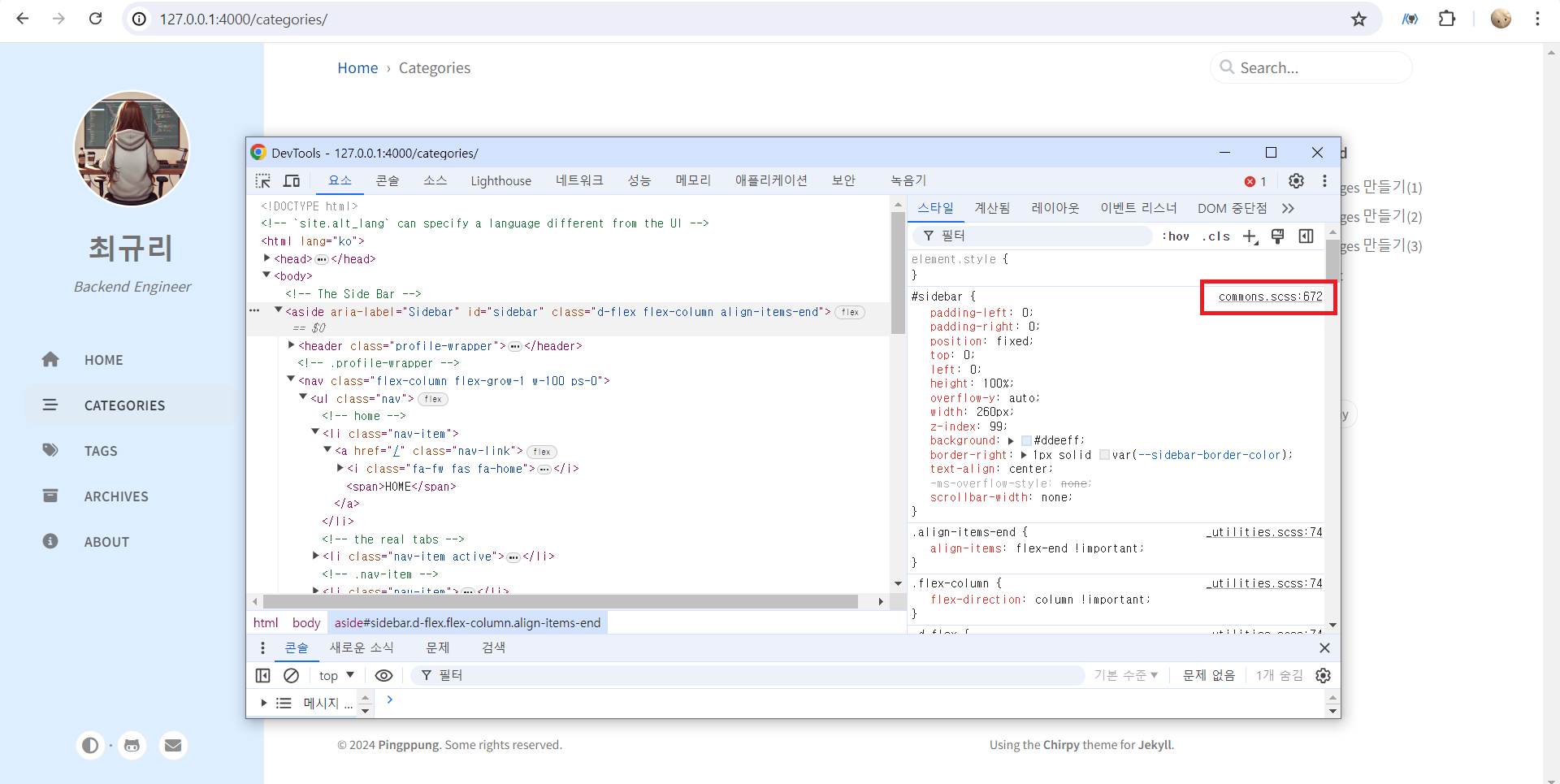 개발자 모드로 찾아본 기존 Chirpy의 사이드바 CSS는 아래와 같습니다.